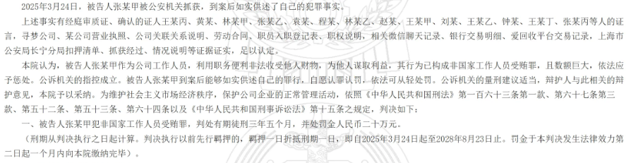 2025年3月25日,张某甲因涉嫌非国家工作人员受贿罪被上海市公安局长宁分局刑事拘留,同年4月25日被逮捕。