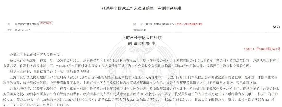 近日,上海市长宁区人民法院判决书,就披露了原系拼多多招商运营经理的受贿案例。其中,受贿细节的揭露,让人感到触目惊心。