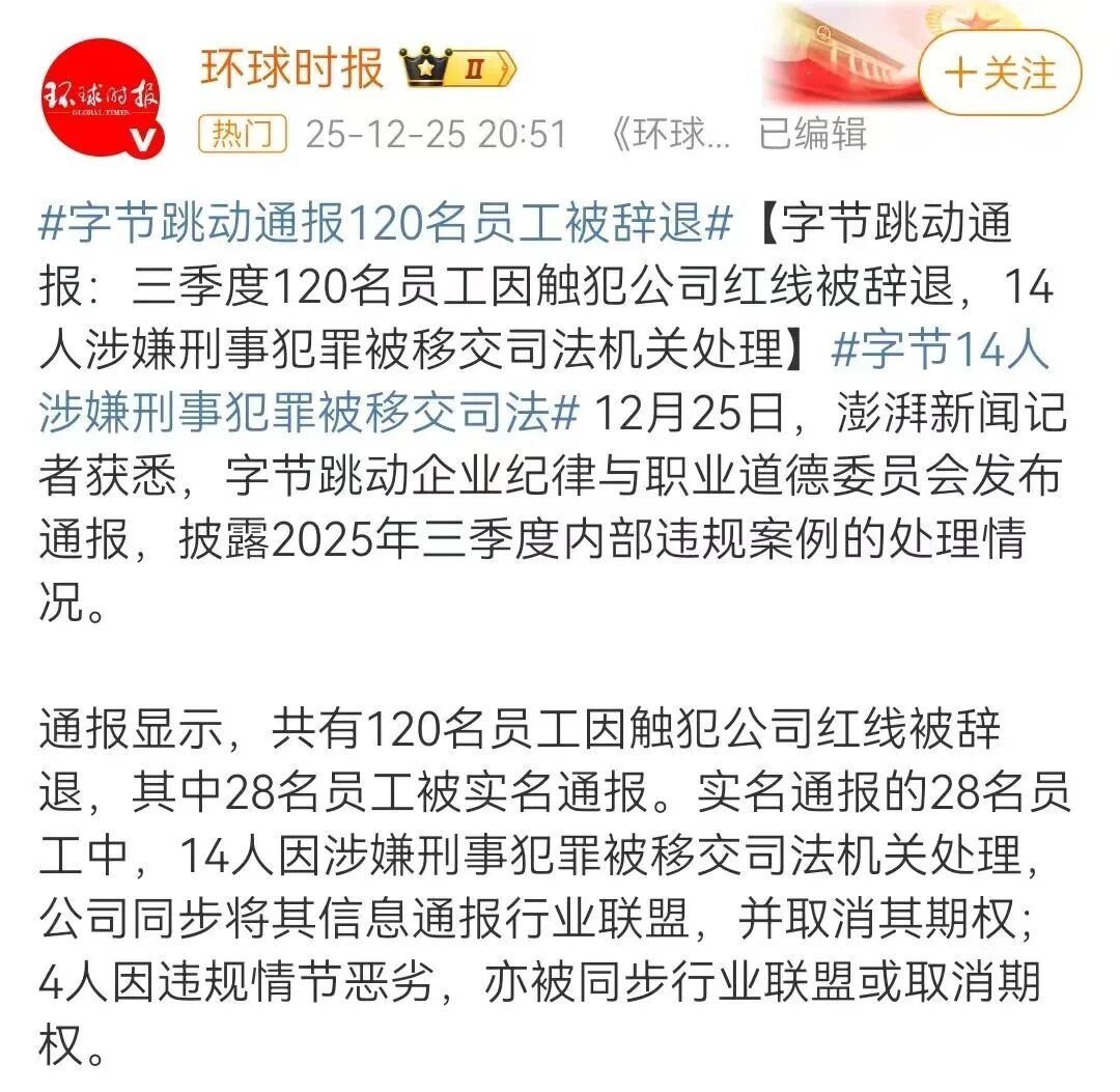 字节跳动设立有企业纪律与职业道德委员会,负责企业内部的违规案例处理。去年年底,企业纪律与职业道德委员会就发布通报,披露2025年三季度共有120名员工因触犯公司红线被辞退,28名员工被实名通报,其中 14 人涉嫌刑事犯罪被移送司法。