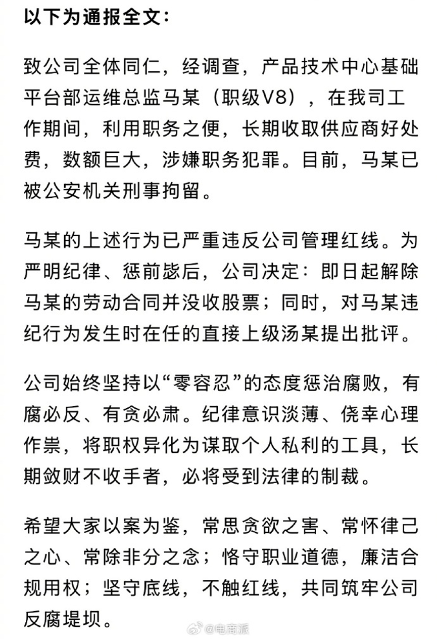 互联网大厂对于员工的贪腐行为零容忍,不管员工的职务大小,一旦触碰红线,绝不手软,该怎么办就怎么办。