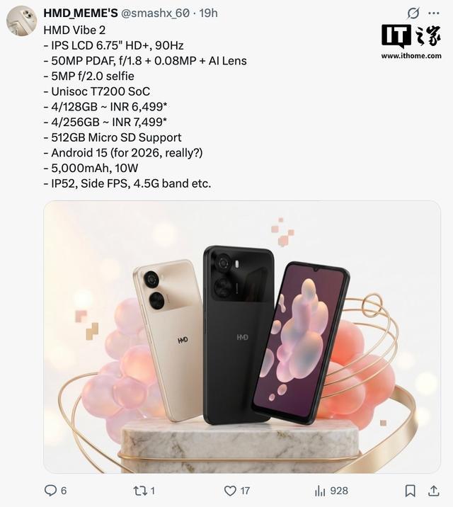 IT之家 4 月 22 日消息,消息源 smashx_60 现已公布了 HMD Global 旗下入门手机 Vibe 2 的完整规格,该机将于近期在印度市场上市,其采用紫光展锐 T7200 处理器,匹配 4GB RAM 及 128/256GB 存储空间股票配资10倍,定价为 6499 印度卢比(IT之家注:现汇率约合 476 元人民币)起。