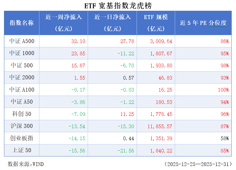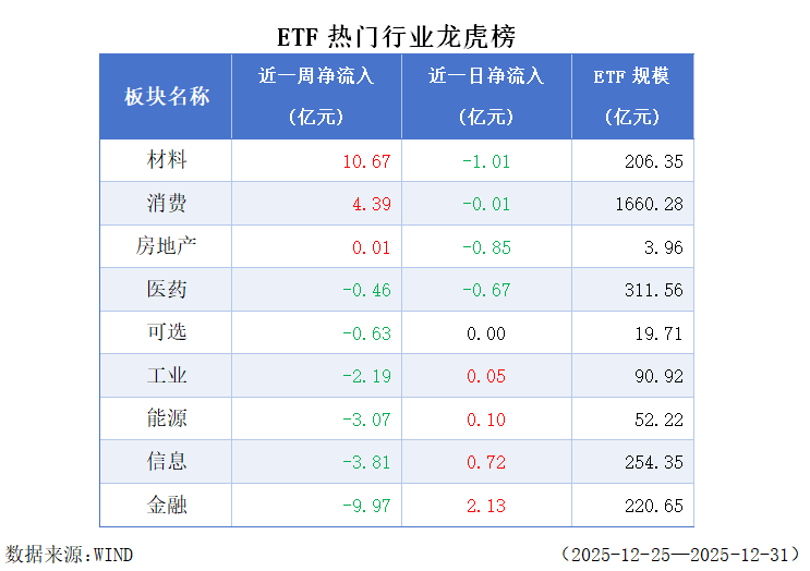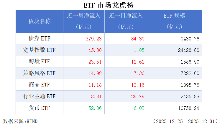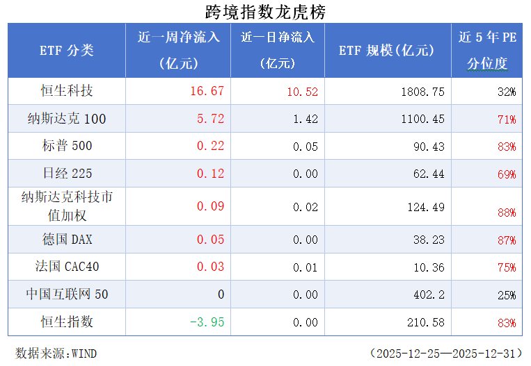 2025年最后5个交易日,资金大幅流入债券ETF,市场风险偏好下降。结构性机会集中在中小盘,中证500、中证1000等中小盘指数资金流入明显,市场在寻找估值相对合理、成长性较好的标的。行业分化加剧,材料、消费等板块受关注,而金融、信息、能源、工业等遭遇净流出,但值得注意的是,最后一个交易日,金融获得显著净流入,材料、消费则转为净流出。跨境配置方面,资金持续流入港股科技及美股科技类方向。