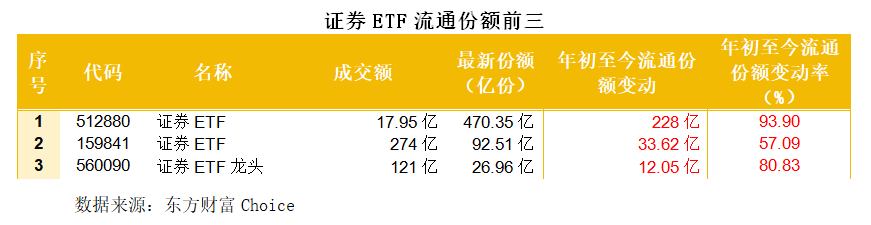 三只基金持仓结构一致,但规模差异显著。截至2025年12月,证券ETF(512880)规模超570亿元,证券ETF(159841)约102亿元,证券ETF龙头(560090)约35亿元),导致个股持股市值规模悬殊。东方财富、中信证券、国泰海通为三只基金共同的前三大重仓股,体现指数编制对头部券商的集中覆盖。