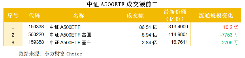 近一周,份额增加最大的指数标的为中证A500(+1.08%),该指数市盈率为17倍,有40只基金跟踪。