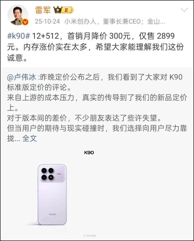 去年红米K90发布后,雷军就曾无奈地透露过涨价的势头和原因。